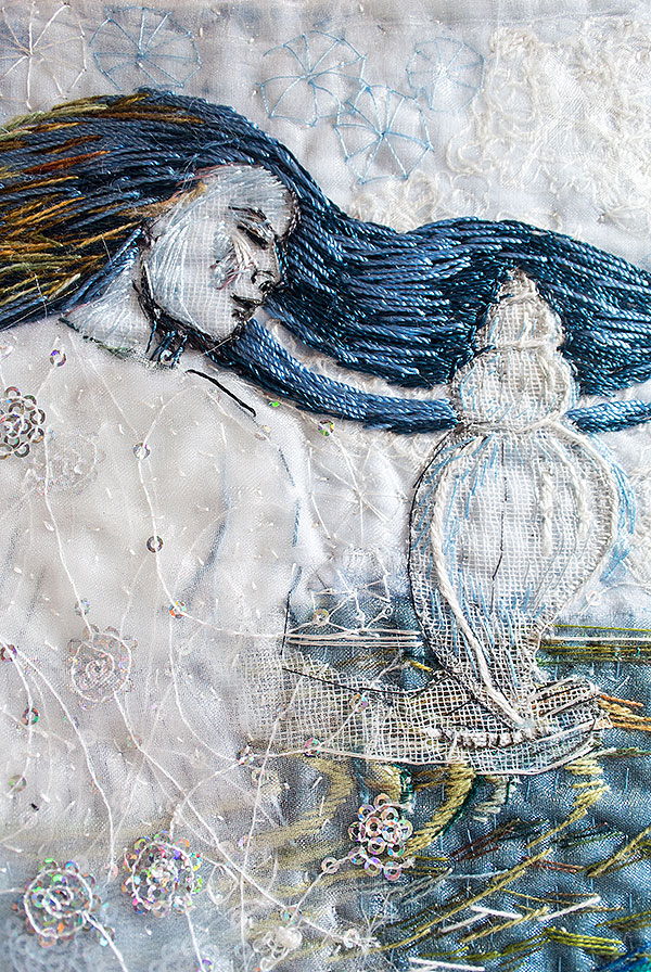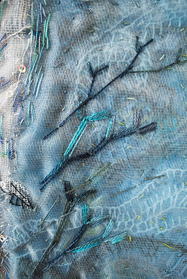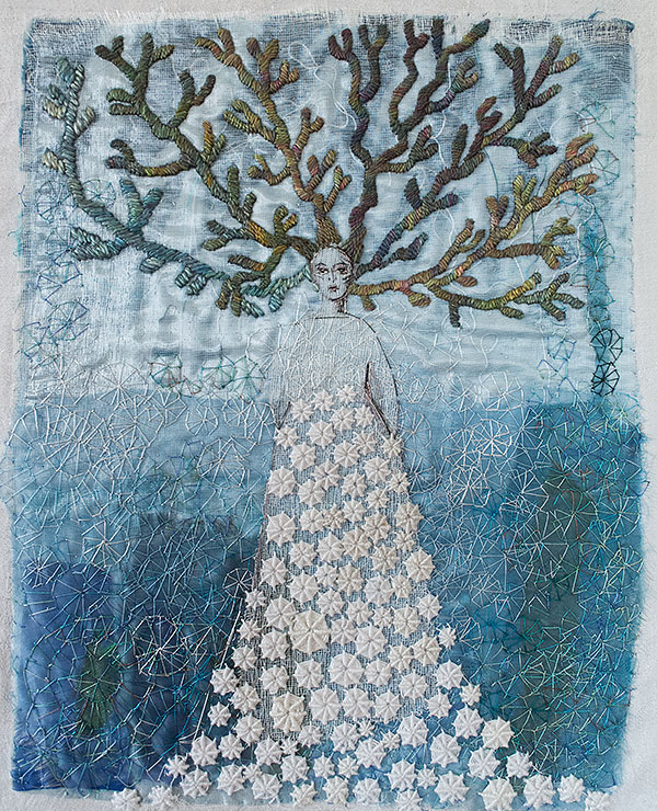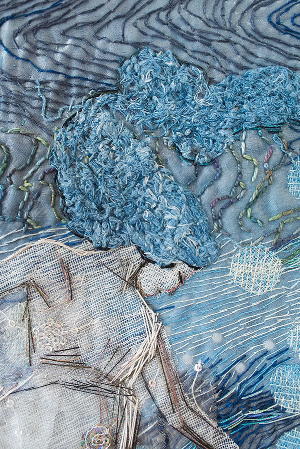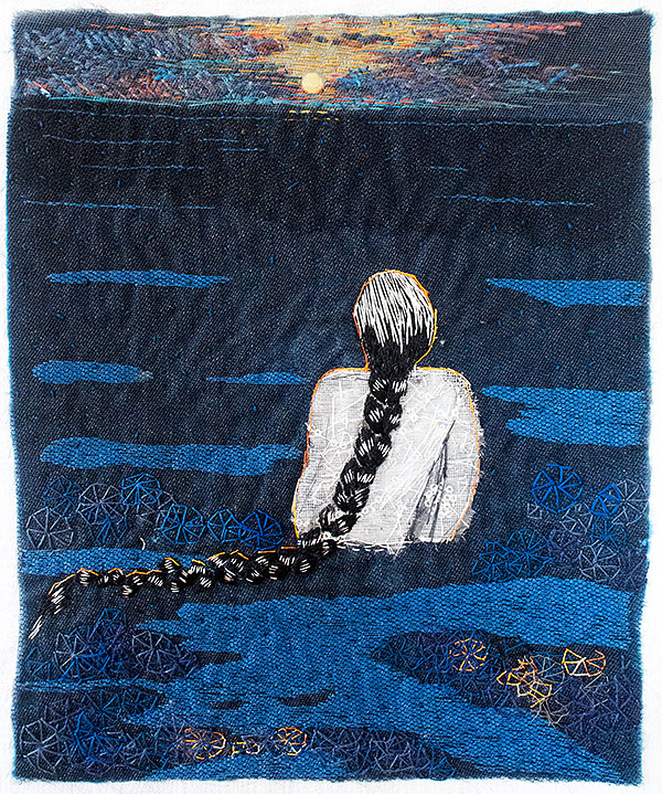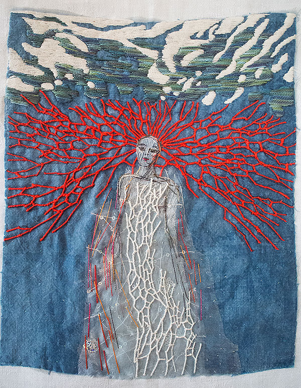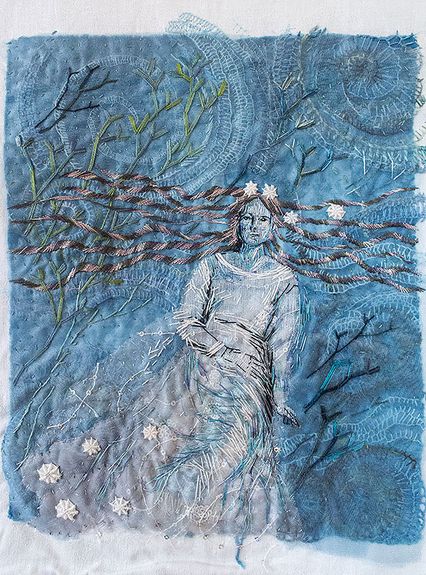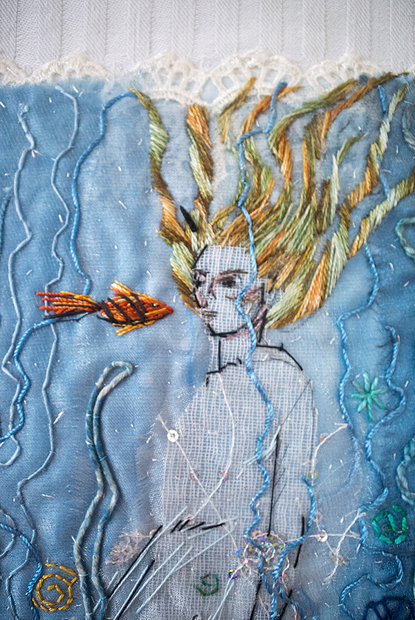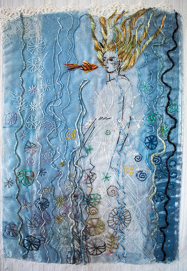Milda var den första, som simmar i havet bland tång och havstulpaner. Samtliga bilder har sin början i en bit indigofärgad tyg, så den fina havsblå tonen är återkommande.