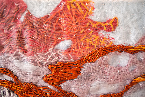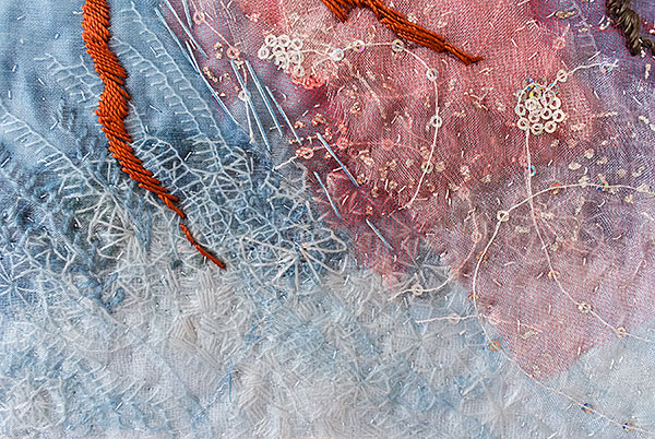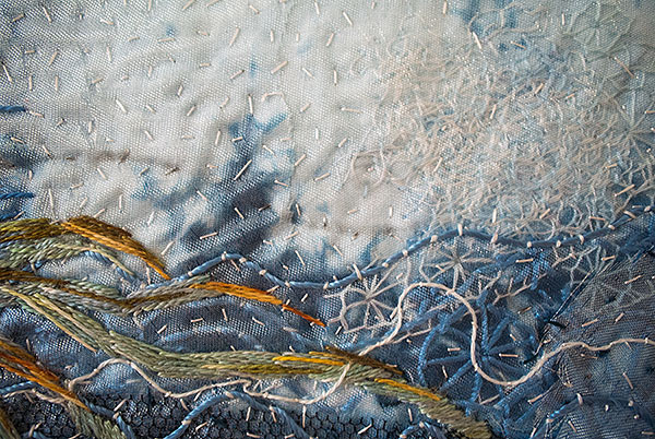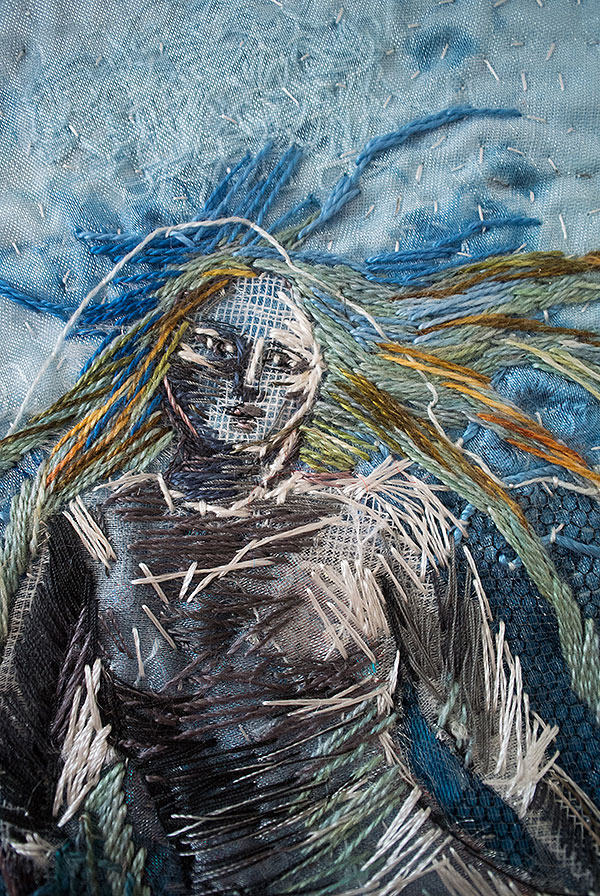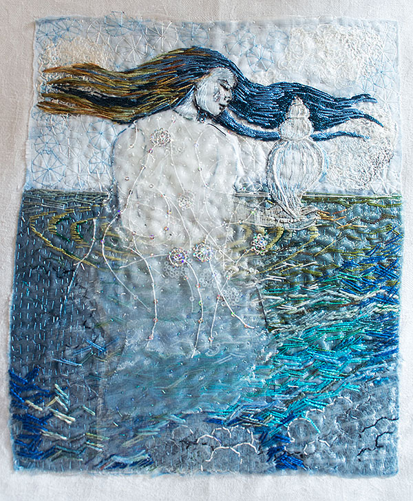Milda var den första, som simmar i havet bland tång och havstulpaner. Samtliga bilder har sin början i en bit indigofärgad tyg, så den fina havsblå tonen är återkommande.