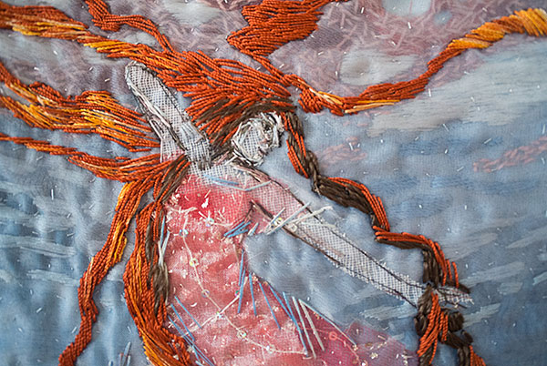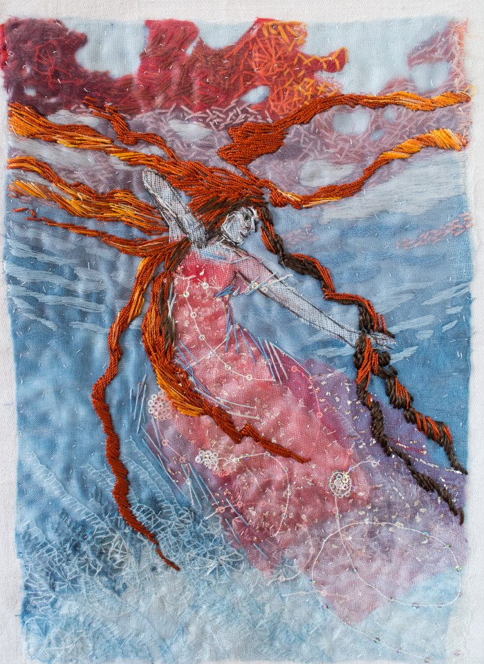 den tredje är den krigiskt vildsinta, när vatten och blod blandas efter ett sjöslag. Namnet är så dramatiskt att jag valde att behålla det, och bilden var lätt att gestalta eftersom den var klart avvikande. Det var roligt att få leka lite med den röda färgen i allt det blå.